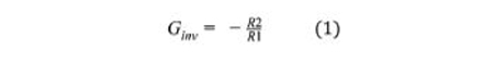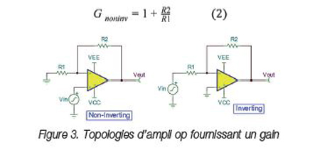 Pour concevoir un étage de gain d’ampli op simple, on commence par sélectionner un amplificateur présentant la tension d’alimentation et le produit gain-bande adaptés à l’application. Les équations de gain 1 et 2 déterminent la valeur des résistances R1 et R2 pour les circuits d’amplificateur opérationnel inverseur et non-inverseur classiques représentés par la Figure 3 :