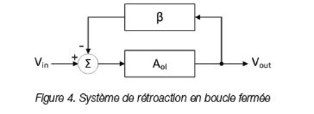 Rappelez-vous qu’un circuit d’ampli op à rétroaction négative (comme les deux circuits illustrés par la Figure 3) peut être représenté sous la forme d’un système à boucle fermée classique (voir schéma de la Figure 4). Aol représente le gain en boucle ouverte de l’amplificateur, et β le facteur de rétroaction, défini dans cet exemple par les résistances R1 et R2.