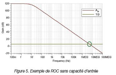 La Figure 5 représente un amplificateur idéal avec un pôle unique sur Aol et un gain d’ampli non-inverseur de 2 ou 6 dB. Aol affiche une pente de - 20 dB/décade et 1/β une pente de 0 dB/décade. Avec l’équation 4, on obtient un ROC de 20 dB/décade, ce qui donne une marge de phase du gain en boucle comprise entre 45 et 90 degrés.