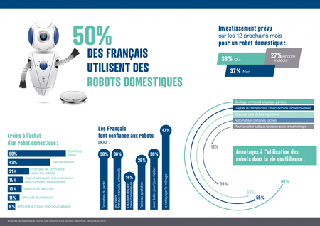 Si 36% des répondants envisagent d’acheter un robot dans les douze prochains mois, et 27% restent indécis sur le sujet, le prix élevé des robots reste un frein à l’achat pour 60% des Français. Toutefois, la question de la confiance et de la sécurité reste un point d’interrogation pour les français puisque 21% n’ont pas confiance dans les robots, et 27% évoquent des inquiétudes concernant la sécurité ou la protection des données. Mais combien les Français sont-ils prêts à dépenser pour un robot ? 36% dépenseraient entre 100 et 500 euros. 25% envisageraient un budget de 500 à 750€. Enfin, 16% des répondants pourraient dépenser jusqu’à 1 000 euros pour un robot. Ces chiffres relativement élevés démontrent que les Français sont prêts à mettre la main au porte-monnaie pour s’offrir un robot aux fonctions innovantes.