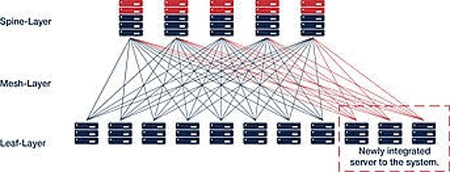 L’architecture entièrement maillée Leaf-Spine est de plus en plus utilisée dans les infrastructures modernes et redondées des data centers. Dans ce schéma, chaque routeur ou commutateur de la couche Spine est connecté à tous les routeurs, commutateurs ou serveurs de la couche Leaf, ce qui se traduit par une très faible latence, une grande redondance maximale et une évolutivité aisée. Les inconvénients des architectures redondées sont : l’augmentation du nombre de câbles à installer, des typologies complexes de connexions croisées, un augmentation des temps d’installation, de certification et de repérage. La solution CrossCon® apporte tous ses bénéfices.