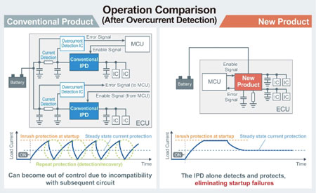 Les nouveaux BV2Hx045EFU-C sont les premiers IPD à côté haut de l’industrie capables de fournir une protection autonome contre les surintensités de courant en incorporant une fonction de protection originale contre les surintensités. Les IPD conventionnels ne protègent contre le courant d’appel qu’au démarrage, de sorte que les MCU et les CI de détection de surintensité sont nécessaires pour la protection des courants de régime permanent. Et donc, il reste toujours la possibilité d’une situation non maitrisée en raison de problèmes de compatibilité avec les circuits ultérieurs connectés à la sortie de l’IPD. En revanche, cette nouvelle série peut protéger le système à la fois contre les appels de courant et les surintensités en régime permanent, assurant ainsi une plus grande sécurité du système en fournissant une solution de haute fiabilité avec moins de pièces par rapport aux produits conventionnels. De plus, la plage de protection à maximum de courant peut être ajustée avec des composants externes pour permettre une large compatibilité.