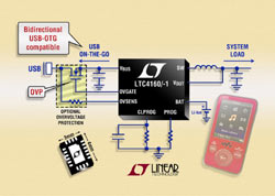 Le régulateur à découpage, intégré, possède aussi les caractéristiques de limitations programmables du courant d’entrée à 100 mA et 500 mA, pour une plus grande compatibilité avec l’alimentation USB, ainsi qu’une limitation à 1,2 A à partir d’un adaptateur mural. Pour une charge rapide, le LTC4160/-1 convertit la quasi totalité des 2,5 W, disponibles sur le port USB, en courant de charge, permettant d’obtenir jusqu’à 600 mA à partir d’une alimentation USB limitée à 500 mA et jusqu’à 1,2 A d’un adaptateur mural. Le circuit possède un circuit de contrôle OVP (protection contre les surtensions) qui empêche les dommages en entrée causés par une application accidentelle de fortes tensions. Le circuit OVP peut protéger le port USB même quand le circuit intégré fournit de la puissance à l’USB OTG.