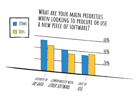 De plus, tous s’accordent à dire que la sécurité des données est leur préoccupation principale lors de la fourniture de nouveaux logiciels, et ce pour 53 % des décideurs informatiques et 47 % des développeurs. C’est une bonne nouvelle.