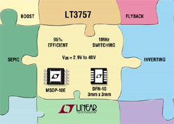 Le LT3757 fonctionne à partir d’une tension d’entrée, de 2,9 V à 40 V, atteint des rendements de 96%, et convient aux applications industrielles, de l’automobile, médicales et les télécommunications. Avec une fréquence de fonctionnement fixe programmable ou pouvant être synchronisée de 100 kHz à 1 MHz, les concepteurs ont le choix parmi une large gamme d’inductances et de condensateurs pour optimiser la taille, le fonctionnement et le coût. La fréquence fixe et le contrôle à mode courant assurent un fonctionnement stable sur une gamme étendue de tensions d’alimentation et de sortie, avec des conceptions à condensateurs à diélectrique céramique, permettant des solutions de plus petite taille.