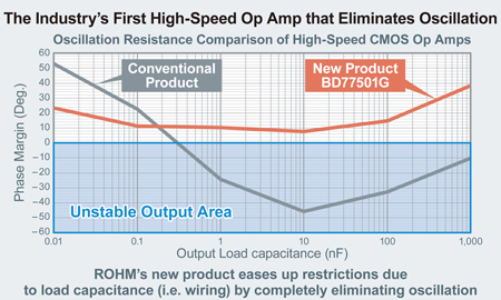 Contrairement aux amplificateurs opérationnels conventionnels pouvant s’avérer difficiles à utiliser en raison des restrictions imposées au câblage et aux composants périphériques résultant de l’instabilité induite par la capacitance de charge, le nouvel amplificateur opérationnel de ROHM élimine les oscillations pour parvenir à un fonctionnement stable et facilite la conception d’application.