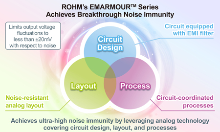 EMARMOUR™ est la marque unique de ROHM pour identifier ses produits tirant parti de ses ses technologies propres couvrant la conception de circuits, la disposition et les processus pour parvenir à une immunité ultra-haute au bruit. Cette technologie limite la fluctuation de la tension de sortie à moins de ± 300 mV dans toute la bande de fréquence de bruit pendant les tests d’évaluation du bruit selon la norme internationale ISO11452-2. Cette immunité au bruit sans précédent réduit les ressources de conception et dans le même temps améliore la fiabilité en résolvant les problèmes liés au bruit dans le développement de nombreux systèmes.