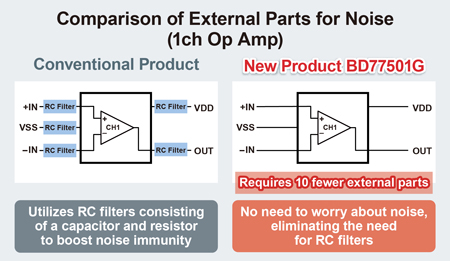 Le BD77501G fournit une immunité au bruit supérieure éliminant le besoin de composants externes anti-bruit conventionnellement requis pour les produits standard (c’est-à-dire les filtres RC pour l’alimentation électrique, les broches d’entrée et de sortie). Par exemple, dans le cas d’un amplificateur opérationnel 1 ch, le nouveau produit de ROHM requiert 10 composants de moins que les solutions conventionnelles.