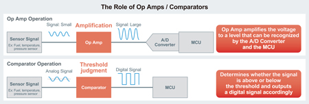 Les comparateurs sont couramment utilisés pour déterminer la valeur de seuil de signaux d’entrée. Ils sortent un signal haut/bas après avoir évalué le seuil du signal de sortie du capteur.