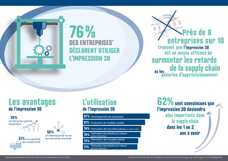 Dans un contexte actuel difficile pour les entreprises, marqué par la crise du Covid-19 et les fermetures des frontières, près de 8 entreprises françaises sur 10 trouvent que l’impression 3D est un moyen efficace de surmonter les retards de la supply chain ou les pénuries d’approvisionnement. 62 % d’entre elles pensent même que cette technologie deviendra de plus en plus importante d’ici 2022.