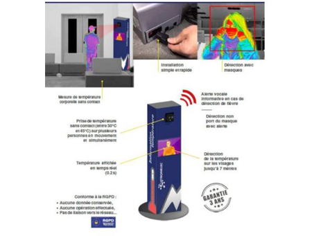 En option, le système peut permettre la détection du port du masque (obligatoire dans tous les magasins et lieux publics fermés à partir de lundi prochain en France), s’il détecte que quelqu’un ne porte pas de masque l’alarme se déclenchera.