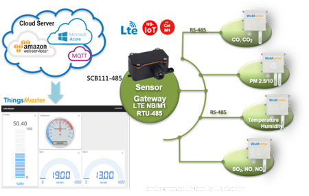 La passerelle lit les données des appareils ou capteurs RS485 RTU et les envoie au serveur cloud en protocole MQTT via le réseau cellulaire NB-IoT ou LTE Cat M1.
