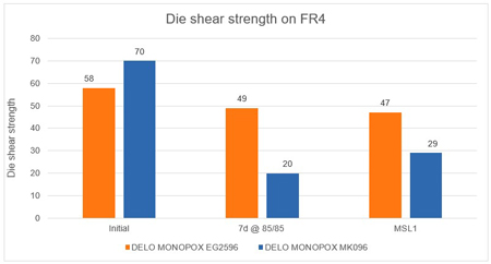 Figure 1 : Le DELO MONOPOX EG2596 a une résistance au cisaillement plus élevée que le DELO MONOPOX MK096 sur FR4 (puce en silicium de 1x1 mm² sur FR4).