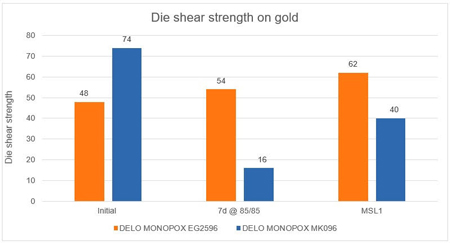 Figure 2 : Même après des essais de vieillissement typiques, le DELO MONOPOX EG2596 atteint des résistances au cisaillement sur substrat d’or nettement plus élevées que son prédécesseur (puce de silicium de 1x1 mm² sur or).