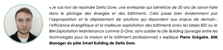 Avec plus de 10 000 sites tertiaires et industriels équipés dans le monde, Delta Dore a su s’adapter aux spécificités et continue d’accompagner les gestionnaires de bâtiment sur l’ensemble de leurs projets d’efficacité énergétique. Intégrer un Manager BIM permet au groupe, d’une part, de renforcer ses compétences et de réaffirmer sa légitimité sur les sujets du BIM à l’instar de D-One, solution qui intègre, en son cœur, la maquette BIM. Cette plateforme web unique agrège et traite toutes les données nécessaires au pilotage des bâtiments. D’autre part, cette expertise complémentaire a également pour objectif d’offrir un accompagnement au plus près des besoins des clients et prospects grâce à une communication adaptée au degré de connaissances des interlocuteurs.