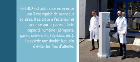 Euro-Process a décidé de commercialiser deux versions de ces distributeurs. Pour s’adapter aux contexte économique complexe et s’affranchir d’investissements complémentaires, il est proposé des solutions de locations mensuelles. Ces deux produits innovants sont dotés de capteurs qui vont permettre d’éviter tout contact avec le distributeur et d’assurer une dose de gel en moins d’une seconde. Cette rapidité qui assure une fluidité de passage aux utilisateurs est l’argument différenciant de la marque. Ils ont une autonomie en gel leur permettant de distribuer jusqu’à 18.000 doses sans nécessité d’intervention. En cas de manque de gel hydroalcoolique ou de dysfonctionnement, les distributeurs pourront adresser automatiquement un message d’alerte par SMS aux gestionnaires des bornes. Outre la performance de ces bornes liée à l’expertise électronique d’Euro-Process, le distributeur GELBOX est également doté de panneaux solaires. Il est donc pour sa part, autonome en énergie. Son double passage est une exclusivité que seule Euro-Process propose sur ce marché.
