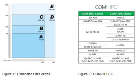 Outre d’autres améliorations, cela permet une plus grande puissance d’entrée et des capacités d’extension E/S optimisées. La taille des cartes disponibles permet l’adoption de processeurs de puissance élevée. Les plus grands modules COM-HPC sont dotés de 4 à 8 connecteurs d’extension DIMM longs. De plus, la conception thermique du module (TDP) supporte les processeurs jusqu’à 110 W (en comparaison : COM-Express ne va que jusqu’à 65 W). COM-HPC accepte des puissances d’entrée supérieures à 300 W, afin d’offrir de très bonnes performances avec des appareils puissants. La taille "E" offre jusqu’à 1 To de mémoire avec 8 modules DIMM longs. La taille "C" offre 128 Go avec 4 modules SODIMM (Figure 1).