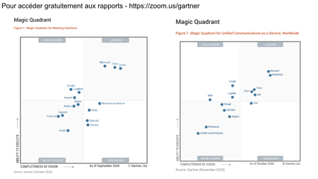 « Nous sommes heureux que Gartner ait désigné Zoom comme leader des Magic Quadrant pour les solutions de réunion et l’UCaaS », a déclaré Éric Yuan, PDG de Zoom. « Nous sommes fiers du rôle que nous avons pu jouer pour maintenir le monde connecté grâce à notre technologie sans friction, fiable et sécurisée. Ce positionnement reconnait notre capacité à satisfaire un large éventail de scénarios de réunions virtuelles grâce à notre conception vidéo et notre engagement à satisfaire le client. “La vidéo est la nouvelle voix, et nous sommes heureux que Gartner ait reconnu la commodité et l’accessibilité de notre offre UCaaS, qui combine Zoom Meetings, Zoom Chat, et Zoom Phone. Nous continuerons à travailler dur pour apporter l’expérience la plus fluide et qualitative possible à tous nos clients, qu’il s’agisse de grandes ou de petites entreprises ».