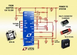 Linear Technology Corporation présente les LTC4012, LTC4012-1 et LTC4012-2, des contrôleurs de chargeur de batterie, à découpage, de fort rendement, pouvant assurer une charge rapide à 4 A, pour plusieurs types de batteries. Le LTC4012 convient aux batteries à un élément ou à plusieurs éléments de type Li-ion / polymère, NiMH, NiCd et au plomb étanche. Le LTC4012 possède une tension de fin de charge programmable, tandis que le LTC4012-1 et le LTC4012-2 utilisent un diviseur résistif interne programmable pour charger de 1 à 4 éléments au Lithium en série à des tensions multiples de 4,1 v et 4,2 V, respectivement.