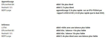 Pour toute une série de modèles courants, les technologies Graphcore ont largement surclassé le système A100 (basé sur DGX) de nVidia, tant au niveau de l’apprentissage que de l’Inférence.