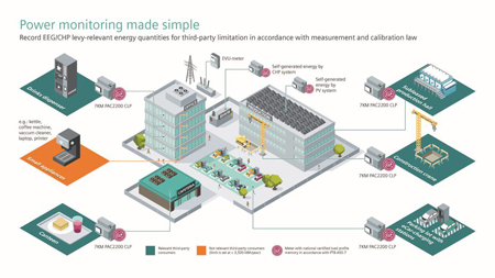 Pour les entreprises qui ne disposent pas d’une alimentation autonome, la détection et la détermination de la puissance active (kWh) avec un appareil de mesure certifié MID sont suffisantes, par exemple à l’aide du Sentron 7KM PAC2200 MID. Avec les appareils de mesure certifiés MID et CLP, les quantités propres et tierces accumulées peuvent être intégrées au bilan et déclarées annuellement.