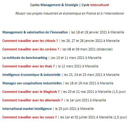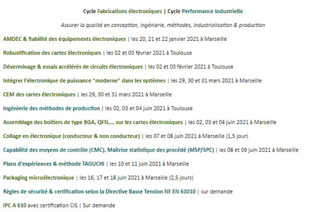 Sur ces thématiques, FRAMATECH et son équipe de formateurs, praticiens et spécialistes dans leurs domaines d’excellence, vous apporteront des solutions opérationnelles pour accroître les compétences de vos collaborateurs. Aussi, nous avons le plaisir de vous transmettre ci-après les dates des formations prévues en présentiel en 2021 (Q1 et Q2), et que nous pourrons réaliser en distanciel, individuellement aux dates mentionnées, ou à n’importe quel autre créneau, pour un groupe de collaborateurs de votre organisation.