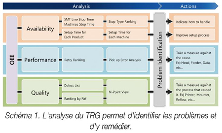 Les outils de suivi de Yamaha Dashboard aident les opérateurs à connaître le statut des équipements et à relancer rapidement les machines et la production en cas de besoin, et les chefs d’atelier et le personnel technique à traiter les problèmes au niveau stratégique et à prendre des mesures pour améliorer les performances grâce à ces données. Au niveau supérieur, les rapports de gestion fournissent l’analyse nécessaire pour évaluer l’état actuel des capacités de production et éclairer la prise de décision à court et à long terme. En identifiant les causes d’une baisse de la disponibilité, des performances et de la qualité, le TRG, et avec lui la productivité, peuvent être améliorés. Les capacités d’analyse des données intégrées dans Dashboard peuvent résoudre ces problématiques. L’analyse telle qu’illustrée sur le schéma 1 quantifie les problèmes et identifie leurs causes, ce qui permet de prendre des décisions quant aux mesures les plus appropriées à prendre.