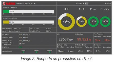 Le recueil de ces données n’est pas simple. Les transformer en informations pertinentes pour résoudre les problèmes et améliorer les résultats mesurés en fin de ligne est une tâche qui a été largement réservée aux logiciels de gestion de lignes CMS. Du moins jusqu’à aujourd’hui. Plusieurs logiciels de gestion de ligne, comme la suite Yamaha Factory Tools, ont aidé les opérateurs et les responsables de la production et de la planification à contrôler les équipements CMS en ligne et ainsi à améliorer l’utilisation, l’efficacité et la productivité. Ils comprennent généralement des outils d’aide à la programmation des machines et à l’équilibrage des lignes et de surveillance de la production en temps réel. Les logiciels de surveillance de lignes, comme M-Tool de Yamaha, permettent quant à eux aux responsables de visualiser le statut des équipements en un coup d’oeil afin de garantir que les composants et les chargeurs soient réapprovisionnés au bon moment pour éviter les arrêts intempestifs. En outre, des outils comme les applications pour smartphone QA Options et Mobile Judgement de Yamaha signalent le moindre résultat d’inspection anormal et contribuent à identifier la cause pour reprendre la production.