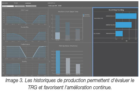 Par ailleurs, les historiques de production permettent de visualiser directement les indicateurs du TRG sous forme graphique, ainsi que les temps d’arrêt, de paramétrage et les erreurs à l’origine des arrêts (Image 3). Des analyses plus détaillées incluent le nombre d’erreurs de prise et les événements à l’origine des arrêts les plus fréquents.
