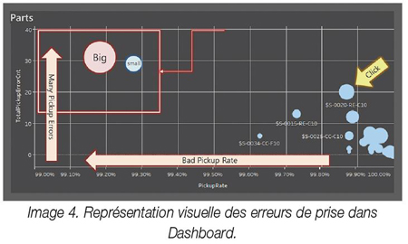 Le tableau de bord Yamaha Dashboard propose plusieurs vues, pour une analyse plus approfondie des problèmes d’équilibrage des lignes, de prise des composants ou autres. Le graphique à bulles de l’Image 4 montre comment Dashboard permet de visualiser facilement les statistiques de prise afin d’identifier les sousperformances et de prendre des mesures nécessaires pour éviter les erreurs de prise.