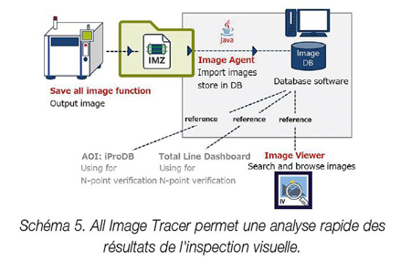 On note souvent des taux de rejet élevés après l’inspection visuelle lorsqu’un nouveau type de composant est introduit sur la machine de placement de la ligne. Afin de réduire au minimum les faux négatifs, de nombreuses données d’image pertinentes doivent être réunies et analysées de manière à identifier tout défaut éventuel de l’image de référence utilisée par le système d’inspection en charge de la reconnaissance du composant. Plusieurs jours sont parfois nécessaires, après que le problème soit survenu pour la première fois, afin de recueillir suffisamment d’informations sur les résultats négatifs et résoudre les problèmes liés à l’image de reconnaissance. Grâce à la puissance des récentes bases de données, il est désormais possible de stocker un grand nombre d’images associées aux résultats négatifs et de les utiliser pour affiner les images de reconnaissance plus rapidement et plus efficacement. Le nouvel outil All Image Tracer de Yamaha est conçu pour stocker en continu toutes les images de vision et ainsi permettre d’analyser un problème dès qu’il survient. Il contribue donc à identifier rapidement les causes des résultats négatifs (Schéma 5) en éliminant le temps traditionnellement requis pour collecter les images après l’incidence du problème. Cet outil aide également les ingénieurs à optimiser rapidement les images de référence afin d’éviter les taux élevés de faux rejets après l’inspection visuelle.