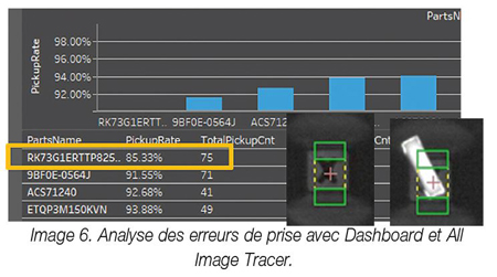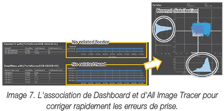 All Image Tracer et Dashboard apportent une capacité supérieure de suivi de la production, en contribuant à identifier et à résoudre rapidement les causes des problèmes. L’Image 6 montre comment Yamaha Dashboard identifie les erreurs de prise les plus fréquentes, tandis que l’analyse ultérieure de ces images à l’aide d’All Image Tracer facilite l’identification rapide de la cause de l’erreur et sa résolution en réinitialisant la hauteur de prise.