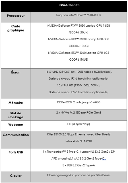 Avec son design unique et discret, le GS66 Stealth est le camouflage parfait pour les professionnels qui cachent un gamer dans leur cœur. Son design haut de gamme a remporté de nombreux prix, tels que le IF Design Award et le Red dot Award 2020. Équipé de cartes graphiques GeForce RTX ™ série 30, la technologie de rendu graphique DLSS AI permet aux gamers de jouer avec une résolution 4K époustouflante, un ray-tracing en temps réel et en 60 FPS pour une expérience de jeu incroyablement réaliste. Le GS66 offre une impressionnante puissance de calcul grâce au dernier processeur d’Intel bénéficiant de 8 cœurs pour de meilleures performances.