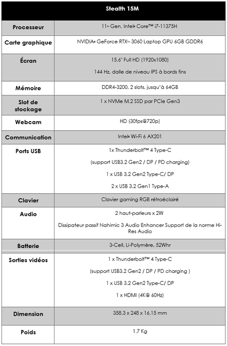 Autre point fort parmi les nouvelles gammes présentées, MSI lance l’ordinateur portable gaming 15’’ le plus fin au monde : le Stealth 15M, un ordinateur ultraportable qui arbore un look sobre mais également inspiré par le style urbain. Pesant seulement 1,7 kg et d’une épaisseur de 16,15 mm, cette machine élégante parvient tout à montrer une puissante capacité de calcul. Il s’agit du premier ordinateur portable gaming au monde équipé d’un processeur Intel de 11ème génération de série H cadencé à 5 GHz, ainsi que des cartes graphiques GeForce RTX™ 30. Le Stealth 15 permet aux joueurs et aux jeunes professionnels de passer de leur jeu à leurs tâches quotidiennes avec efficacité.