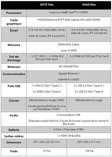 Aussi bien pour les joueurs que le grand public, les ordinateurs portables GF75 et 65 Thin fins et légers sont les meilleurs compagnons. Ils sont l’exemple même qu’un ordinateur portable gaming peut être élégant et accessible. La gamme GF Thin offre un matériel puissant intégrant des processeurs Intel® Core™ i7 et des cartes graphiques GeForce RTX ™ 30, tandis que l’écran IPS avec taux de rafraîchissement de 144 Hz et à bords fins offre une vitesse et une clarté visuelle sans précédent.