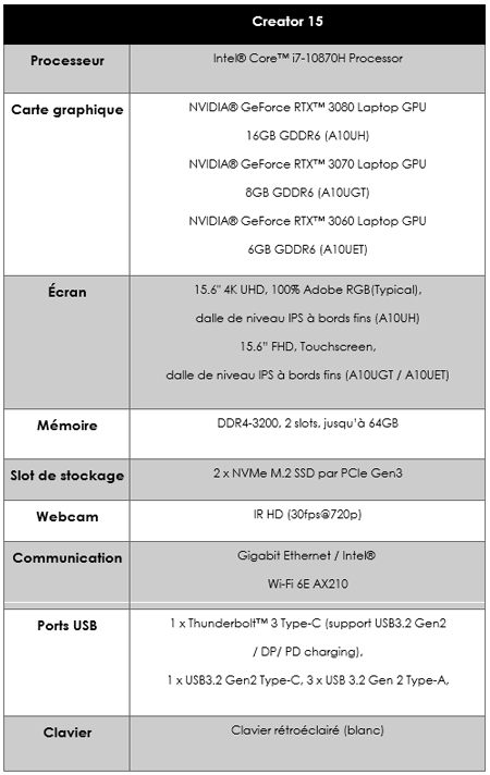 Enfin, n’oubliez pas que MSI s’adresse également aux créateurs. Le MSI Creator 15 est un excellent ordinateur portable polyvalent, spécialement conçu pour les créateurs les plus exigeants. Le Creator 15 garantit l’expérience visuelle la plus réaliste possible car il dispose d’un écran 4K True Pixel calibré individuellement en usine, certifié Calman et délivre 100 % du profil de couleurs AdobeRGB. Soutenu par la puissance des RTX™ 30, le Creator 15 peut considérablement accélérer les temps de rendu des vidéos et des animations 3D. De plus, le nouvel écran tactile offre une navigation plus facile et une augmentation significative de la productivité. La capacité de la batterie de 99,9 Wh et la conception légère assurent une grande mobilité, l’idéal pour les créateurs devant souvent se déplacer.