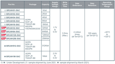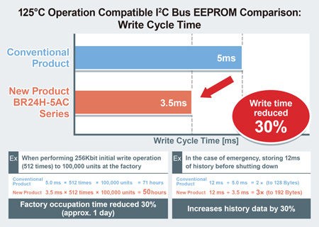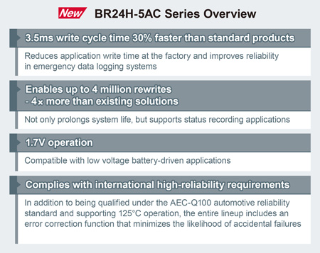 L’EEPROM de la série BR24H-5AC compatible avec un fonctionnement à 125 °C est la première de l’industrie à réaliser un temps d’écriture de 3,5 ms en implémentant une technologie originale de circuit d’écriture et lecture de données, réduisant le temps d’écriture de 30 % par rapport aux 5 ms des produits conventionnels. De plus, contrairement aux produits standard capables d’effectuer seulement 1 million de réécritures, la série BR24H-5AC garantit jusqu’à quatre millions de cycles d’écriture grâce à l’endurance des données, qui non seulement prolonge la durée de vie de l’application, mais aussi se prête idéalement aux enregistrements de données nécessitant des réécritures fréquentes de données.