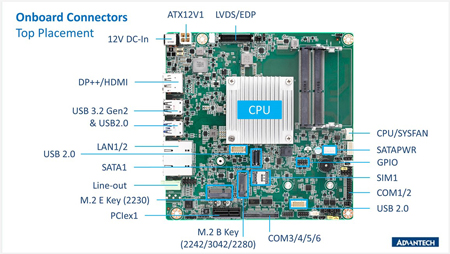 La carte-mère Mini-ITX AIMB-218 dispose d’un port PCIe Gen 3 pour des capacités IA améliorées. Et ses deux slots M.2 (clé E pour un module Wi-Fi et Bluetooth, et clé B avec support de carte SIM pour module LTE ou mSATA) permettent de prendre en charge des réseaux externes ou des solutions de stockage échelonnables.