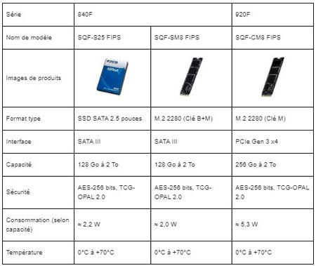 Pour répondre aux besoins de différentes applications, les SSD série SQF 840F/920F sont équipés de moteurs de chiffrement AES-256 conformes TCG-OPAL, assurant un auto-chiffrement avancé. Ce chiffrement supporte le contrôle de protection en lecture et en écriture, ainsi que les mécanismes leaders d’authentification multi-utilisateurs et de zones multi-sécurisées sur le lecteur lui-même. Ces fonctionnalités peuvent être gérées grâce au logiciel de sécurité DeviceOn/SQ Manager, disponible sous Linux et qui peut aussi être intégré au BIOS. En outre, une signature numérique est attribuée dans le code du microprogramme pour empêcher toute modification non autorisée de la racine du SSD. Ces SSD offrent une stabilité hors-pair grâce à un auto-test à la mise sous tension de tous les moteurs matériels liés au chiffrement. Par ailleurs, ces produits sont dotés d’une protection physique inviolable pour empêcher le vol de données par effraction physique. En résumé, les SQF 840F/920F certifiés NIST sont conformes aux spécifications FIPS 140-2 Niveau 2, ce qui garantit une sécurité complète et efficace.