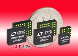 Les LTM8020MPV, LTM8022MPV et LTM8023MPV, sont des régulateurs μModule 36 V, de 200 mA, 1 A et 2 A, encapsulés dans des boîtiers LGA (Land Grid Array) très compacts. Les dimensions du boîtier sont de 6,25 mm x 6,25 mm x 2,3 mm, pour le LTM8020 et de 9 mm x 11,25 mm x 2,8 mm pour les LTM8022 et LTM8023. Pour faciliter la tâche d’implantation du concepteur, le LTM8022 à sortie 1 A et sa version LTM8023 à sortie 2 A, sont conçus avec une implantation et un brochage identiques. Les boîtiers LGA sont qualifiés par plusieurs concepteurs de systèmes militaires comme boîtiers préférés pour une réalisation DC/DC de forte puissance, en raison de son impédance thermique plus faible, par rapport à un boîtier BGA (Ball Grid Array) de taille similaire.