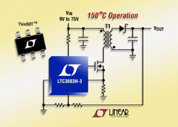 Linear Technology Corporation annonce la version de classe H du LTC3803-3, un contrôleur DC/DC, à récupération d’énergie, en mode intensité, dans un petit boîtier ThinSOTTM de six broches. Ce composant de classe H est garanti pour fonctionner avec une température de jonction jusqu’à + 150°C et est idéal dans les applications de l’automobile et de l’industrie, soumises à des températures élevées. Le LTC3803H-3 peut être alimenté sur une gamme de tensions d’entrée de 9 V à 75 V à travers des résistances en série reliées au régulateur shunt interne du composant. Ce contrôleur convient bien aux applications isolées de l’entrée dont la gamme de tensions varie dans un rapport 1 à 4, que l’on rencontre dans les dispositifs alimentés en 12 V et 42 V du secteur de l’automobile.