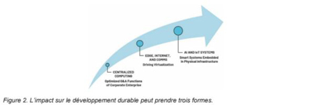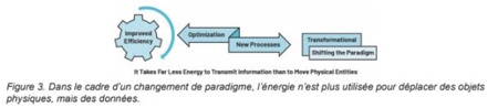 La mise en œuvre de l’IoT et de l’informatique en périphérie de réseau (edge computing) marque un changement de paradigme selon lequel l’énergie n’est plus consommée lorsque ce sont des objets physiques, mais des données qui se déplacent. Ce changement s’opère de deux manières. L’IoT peut être utilisé pour optimiser des processus existants ce qui améliore le rendement ou pour adopter de nouveaux processus. Si ces deux approches sont nécessaires pour influer de façon significative sur le développement durable, l’introduction de nouveaux processus est porteuse de transformations.