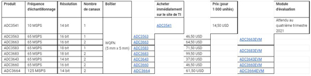 L’ADC3563, l’ADC3583, l’ADC3643, l’ADC3660, l’ADC3663, l’ADC3664 et l’ADC3683 sont disponibles auprès de TI dans un boîtier WQFN (Very thin Quad Flat No-Lead) de 5 mm x 5 mm. L’ADC3541 est proposé dès à présent en version de préproduction, exclusivement sur TI.com, et devrait être produit en quantité à compter du premier trimestre 2022. Les modules d’évaluation sont disponibles auprès de TI au prix de 249 USD. Le site offre différentes options de paiement, de ligne de crédit et d’expédition fiable et rapide.