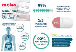 « C’est encourageant de voir l’intérêt exceptionnel que suscite le mode numérique d’administration de médicaments pour améliorer les soins aux patients et produire de meilleurs résultats », affirme Paul Chaffin, président des solutions médicales et pharmaceutiques chez Molex. « L’avenir de l’industrie pharmaceutique réside dans la conception et le développement de dispositifs centrés sur le patient qui sont faciles à utiliser et qui peuvent recueillir et connecter des données de manière transparente et en toute sécurité, afin de personnaliser un traitement tout en accroissant l’observance thérapeutique ».