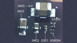 En général, dans les applications médicales, il est préférable d’utiliser la technologie SMT, car elle permet d’utiliser des composants plus petits, ce qui permet de réduire la taille du circuit imprimé et d’augmenter la densité des composants sur la carte. En outre, pour l’assemblage des composants CMS, il n’est pas nécessaire de percer des trous, ce qui diminue à la fois les coûts et le temps requis pour la fabrication et l’assemblage du circuit imprimé. L’un des plus petits boîtiers CMS actuellement disponibles sur le marché est le 008004, illustré sur l’image 2, qui ne mesure que 0,25 mm x 0,125 mm.