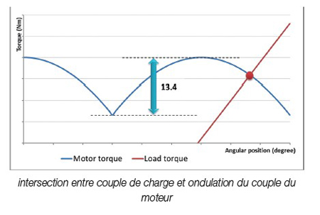 Le concepteur doit également tenir compte de l’influence de la méthode de pilotage, en particulier si l’application fait un usage spécifique du couple de décrochage, comme dans notre exemple de préhenseur électrique. Avec un contrôleur (ou driver) à 6 phases classique (utilisant des capteurs à effet Hall), une ondulation est associée au couple de sortie du moteur. La différence par rapport au sommet et au bas de cette ondulation est égale à 13,4 % du couple maximum disponible. Avec ce contrôleur, le couple de décrochage réel du moteur sera compris dans les limites de cette plage de tolérance de 13,4 % de l’ondulation du couple.