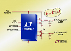 Linear Technology Corporation présente le LTC3868/-1, un contrôleur DC/DC, abaisseur, synchrone, à très faible courant de repos, à sorties deux phases. Le LTC3868/-1 ne consomme que 170 µA, avec une sortie active, et seulement 300 µA lorsque les deux sorties sont actives, ce qui le rend idéal pour les applications alimentées sur batterie. Avec ses deux sorties à l’arrêt, le LTC3868/-1 consomme seulement 8 µA. Le LTC3868/-1 présente une gamme de tensions d’entrée de 4 V à 24 V, et chacune des tensions de sortie peut être réglée entre 0,8 V et 14 V, pour des intensités de sortie jusqu’à 20 A. Avec un rendement pouvant atteindre 95%, un convertisseur DC/DC à base de LTC3868/-1 convient pour l’alimentation des produits industriels et médicaux, ainsi que les instruments portables, les ordinateurs portables, les blocs notes et mini-portables (netbook).