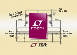 Linear Technology Corporation présente le LTC3857/-1, un contrôleur DC/DC, abaisseur, synchrone, à très faible courant de repos, à sorties deux phases, qui ne consomme que 50 µA, avec une sortie active, et seulement 80 µA lorsque les deux sorties sont actives. Avec ses deux sorties à l’arrêt, le LTC3857/-1 consomme à peine 8 µA. Ce composant est idéal pour les applications de l’automobile pour lesquelles une alimentation ou les deux restent active en mode veille. La gamme de tensions d’entrée du LTC3857/-1, de 4 V à 38 V, est assez étendue pour assurer une protection contre les transitoires de forte amplitude d’entrée rencontrées dans l’automobile, et le fonctionnement dans les conditions de démarrage à froid. Elle couvre un large ensemble d’éléments de batterie de différentes constitutions chimiques. Chacune des tensions de sortie peut être réglée entre 0,8 V et 24 V, pour des intensités de sortie jusqu’à 20 A, avec un rendement pouvant atteindre 95%. Le LTC3857/-1 convient pour l’alimentation des systèmes GPS, audio, des lecteurs CD/DVD et des pilotes de disques.
