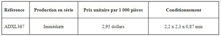 L’accéléromètre ADXL367 consomme seulement 0,88 µA à la fréquence de sortie de données de 100 Hz, et 180 nA en mode réveil avec déclenchement par un mouvement. Contrairement aux accéléromètres qui se réveillent de manière cyclique afin de minimiser la consommation d’énergie, l’ADXL367 ne souffre pas du repliement de spectre des signaux d’entrée par sous-échantillonnage, mais échantillonne la totalité de la bande passante du capteur à toutes les fréquences de sortie de données.