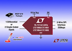 Fonctionnant sur une alimentation unique de 5 V, les CAN 16 bits LTC1864 / LTC1865 et 12 bits LTC1860 / LTC1861 consomment chacun seulement 850 µA et sont garantis pour une vitesse de sortie de 250 kéch./s. Les LTC1864 et LTC1860 sont des CAN, compatibles broche à broche et au niveau logiciel, qui mesurent une tension différentielle d’un canal, en un petit boîtier MSOP-8. Les LTC1865 et LTC1861 sont des CAN, compatibles broche à broche et au niveau logiciel, qui mesurent deux tensions unipolaires, en un petit boîtier MSOP-10.